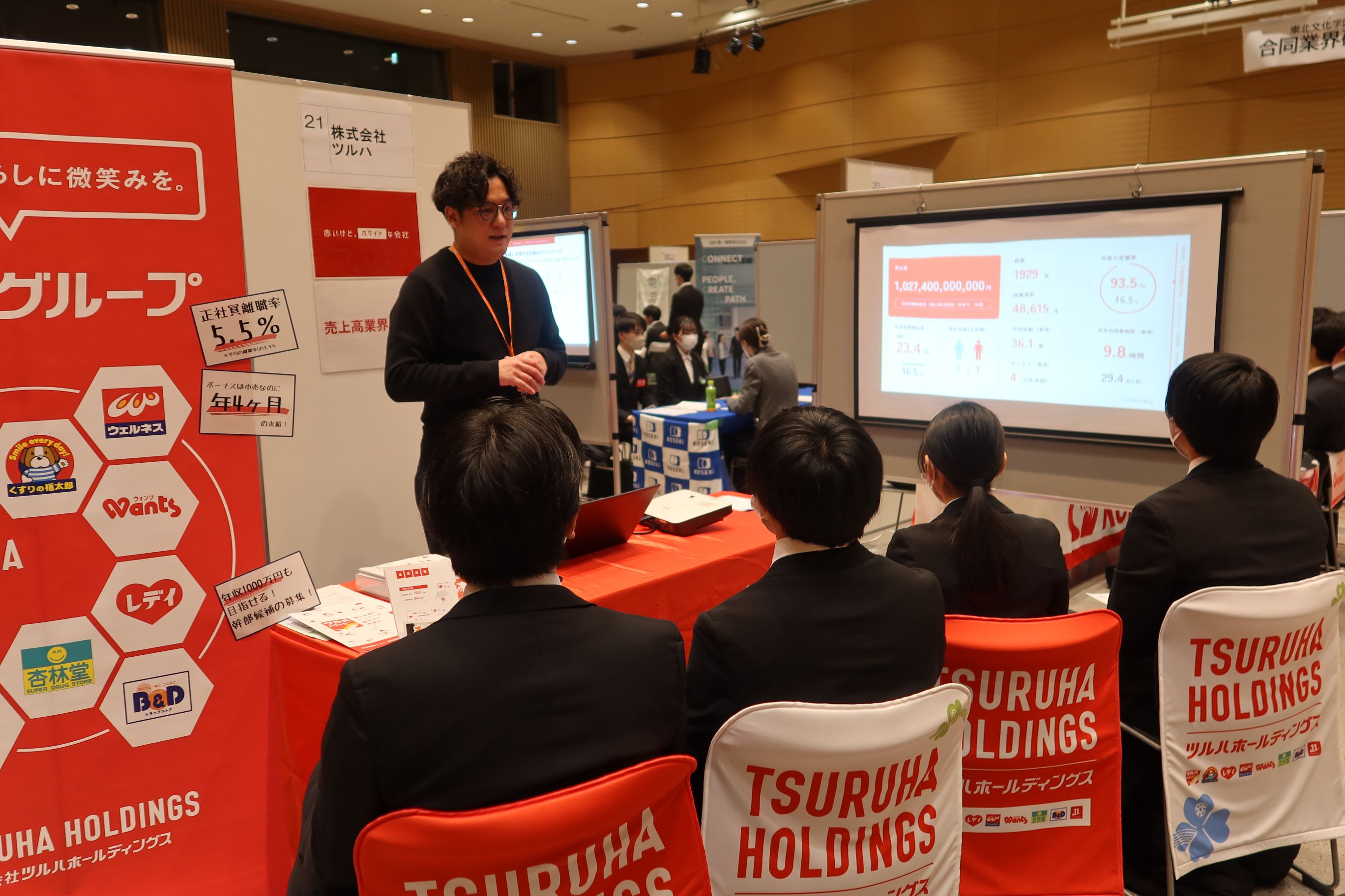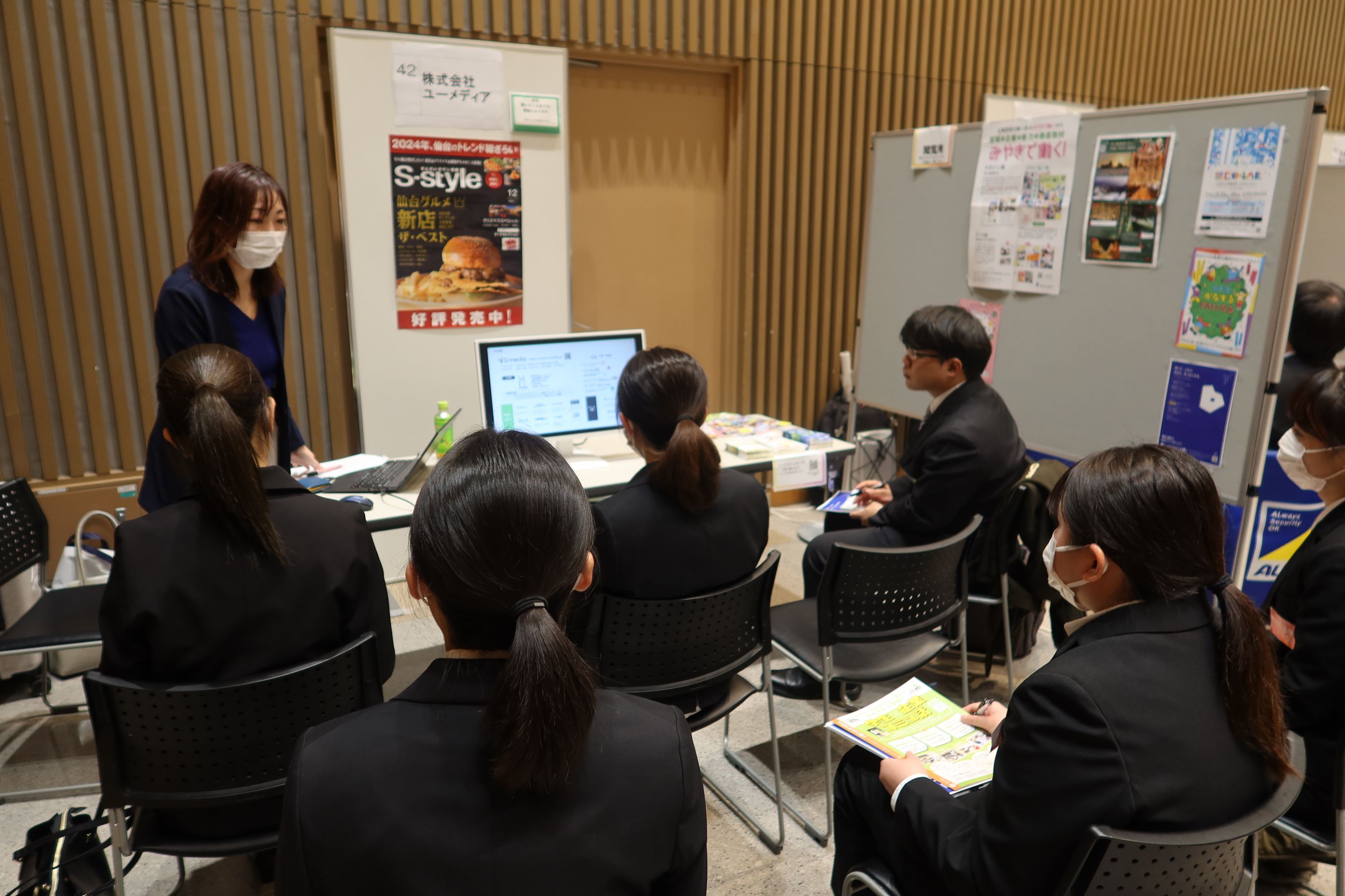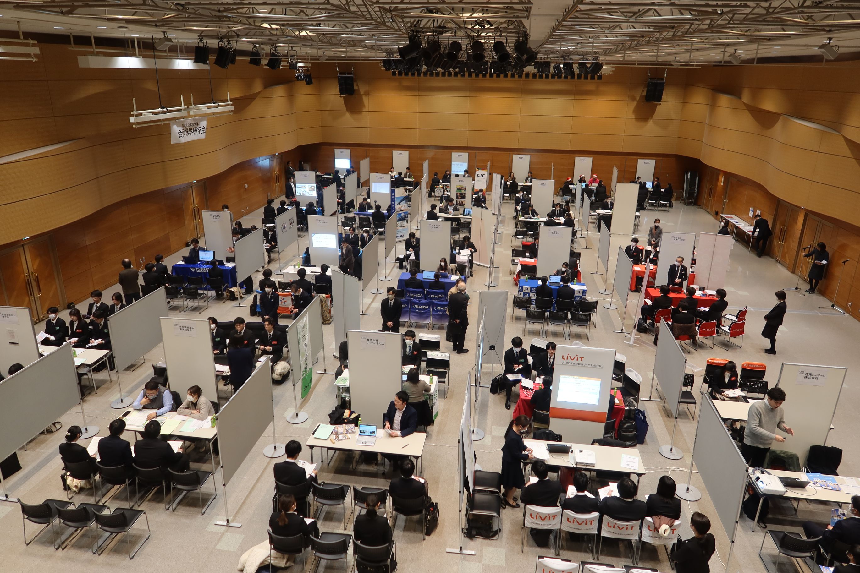 合同業界研究会は昨年度から学外会場(AER)にて対面形式とし、現代社会学科、経営法学科、知能情報システム学科の3学科合同で開催しています。当日はIT系企業や福祉事業所、ものづくり企業も含めた幅広い業種の42社の事業所にご参加いただき、約165名の学生が参加しました。学生達は各社の説明に真剣に耳を傾ける様子が見られました。アンケートからは「知らないことを多く知ることができる非常に有意義なイベントだった」「新たに興味を持った企業を見つけることが出来た」との感想が聞かれ、業界企業選びの視野を広げる機会になったようです。