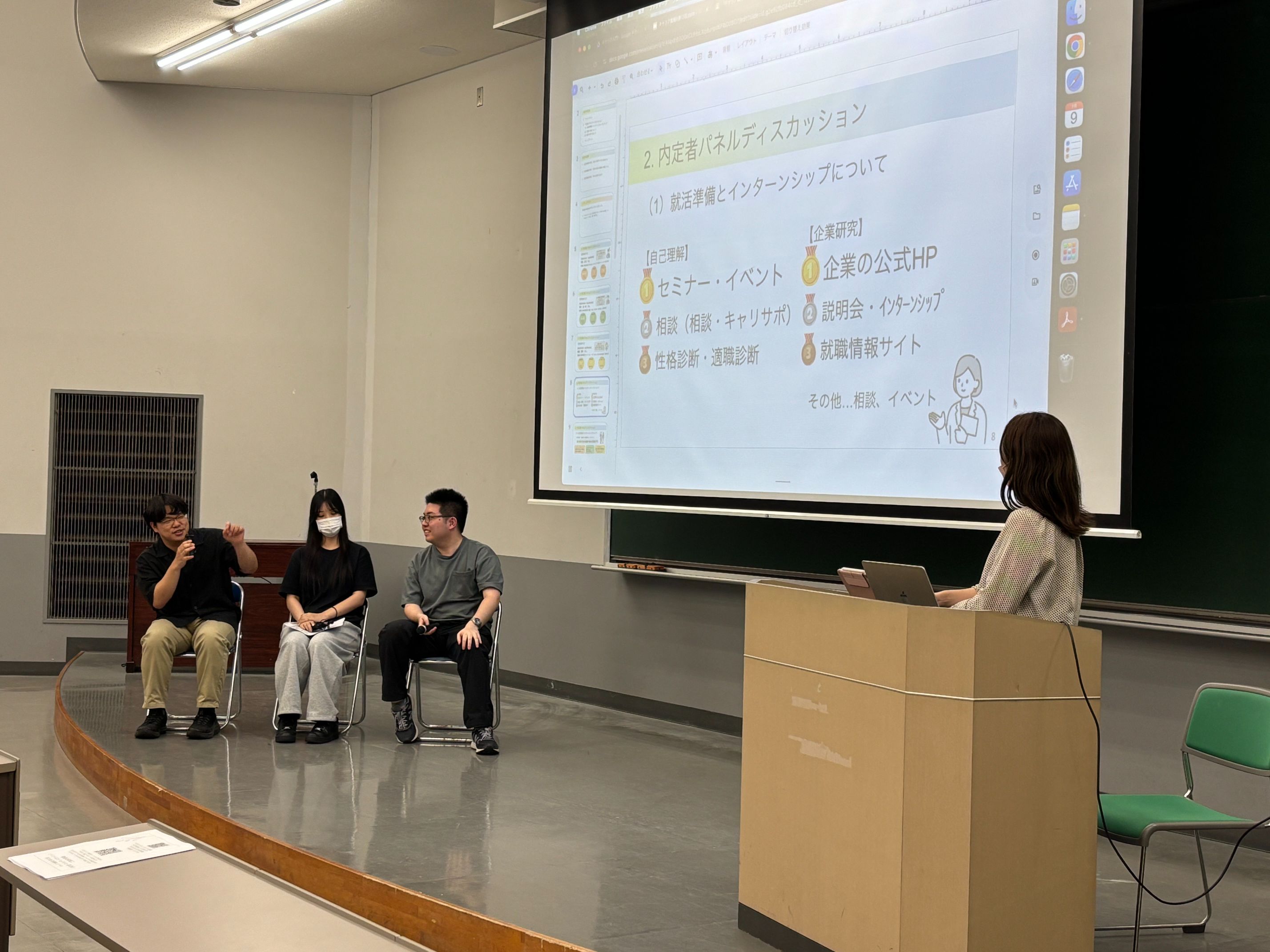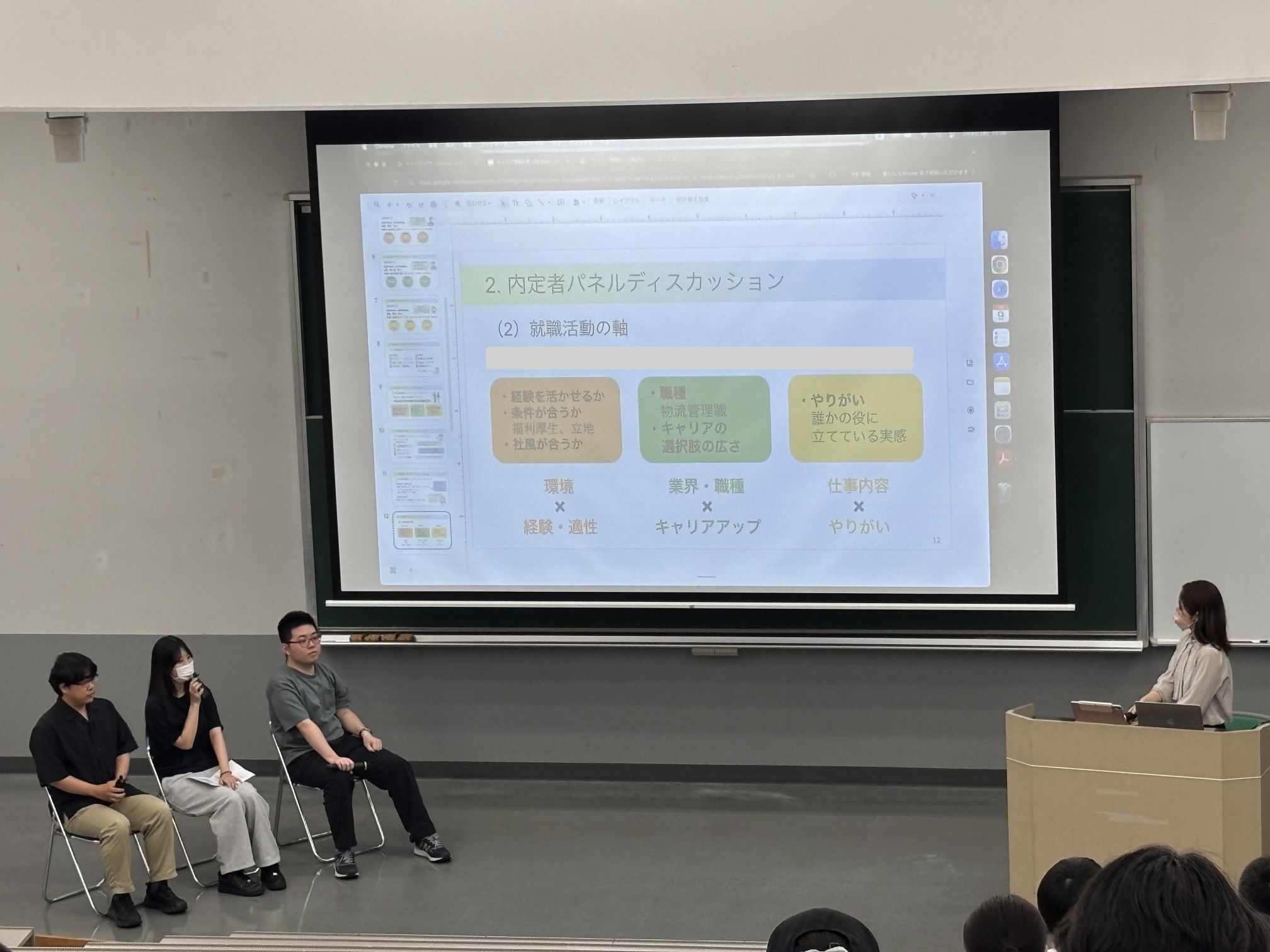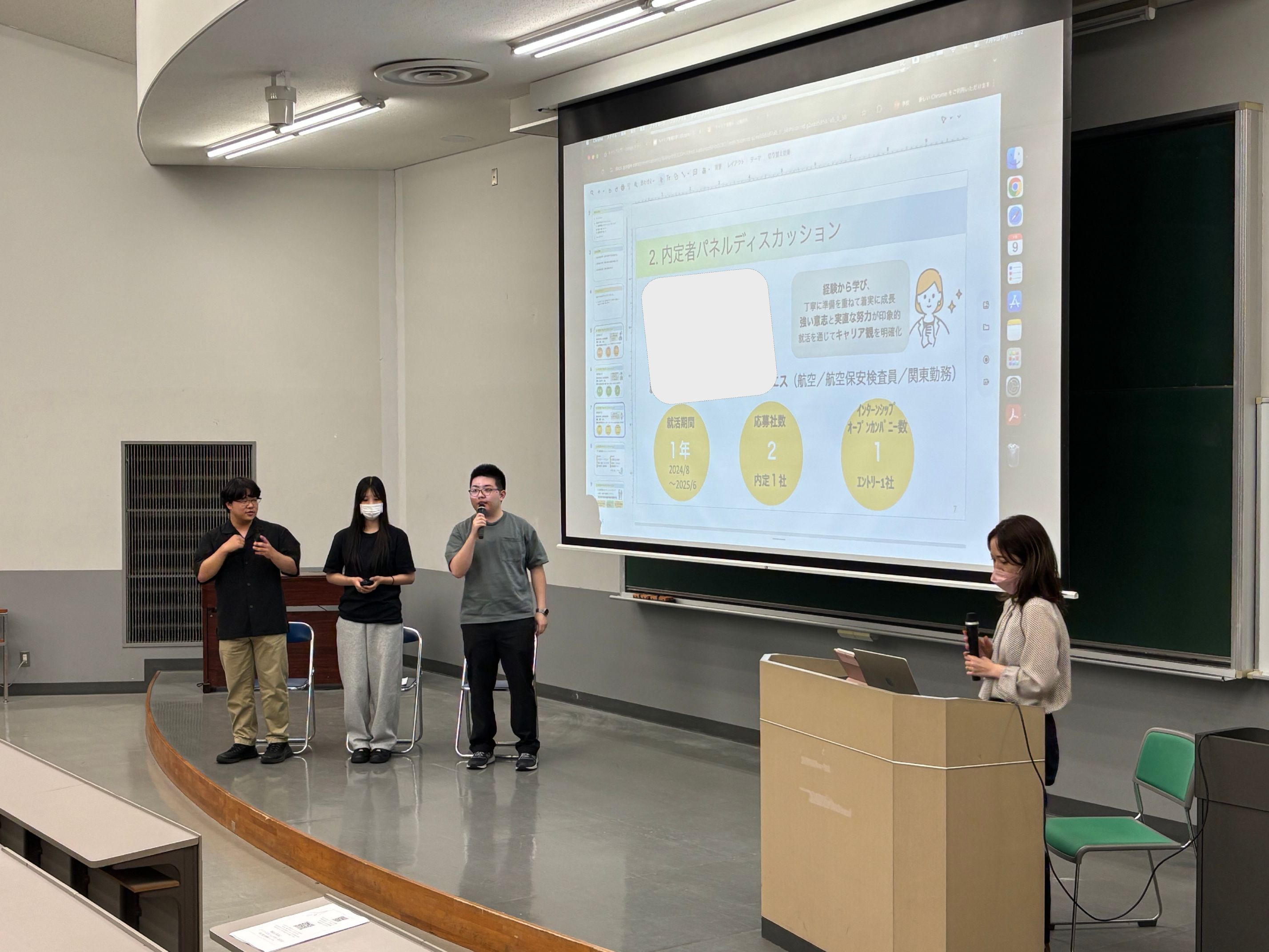 2025年7月9日(水)2限キャリア戦略Ⅲ(経営法学科3年生)において、経営法学科4年生内定者3名にご協力いただき、内定者パネルディスカッションを実施しました。