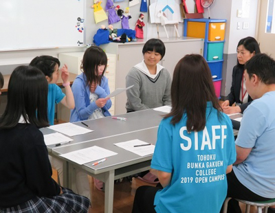 社会福祉科では、虐待やいじめ問題に対応する児童分野のソーシャルワーカーを通して、社会福祉士の魅力を紹介しようと、今回は『児童福祉ソーシャルワーカーの仕事を知ろう』というテーマで授業を行いました。模擬授業では、参加者全員で“理想の子育てサロン作り”を体験し、参加した高校生から「母親や父親の目線で考えることが、普段はあまりないので良い機会となりました。色々な意見があり、とても勉強になったと思います」という感想が聞かれました。