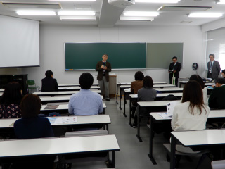全体会では、牧野学科長から入学前準備教育や入学後の学生生活などについて説明がありました。