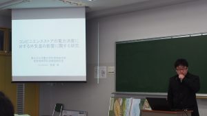 発表した学生は、4年間の学修の成果を発表するため、連日資料やプレゼンテーションの準備をしていました。この発表結果は、教員が主査?副査となって研究発表の内容や論点などについて、評価基準に基づき評価する最終テストでもあります。