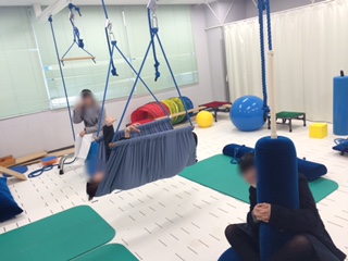 発達支援教室でトランポリンやブランコを体験してもらいながら,こどもの作業療法の特徴について説明しました.体験を通し,作業療法の対象は大人だけでなく,赤ちゃんから老人まで幅広いことを知っていただきました.