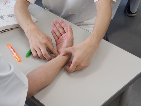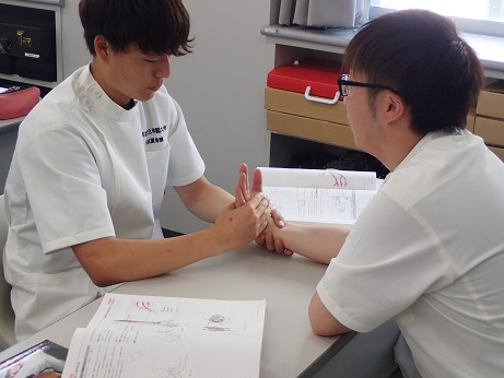 下記の写真は2年生が徒手筋力検査法という筋力を検査する方法を学んでいる様子です。この検査法を学ぶためには解剖学や運動学、生理学といった基礎知識が必要です。