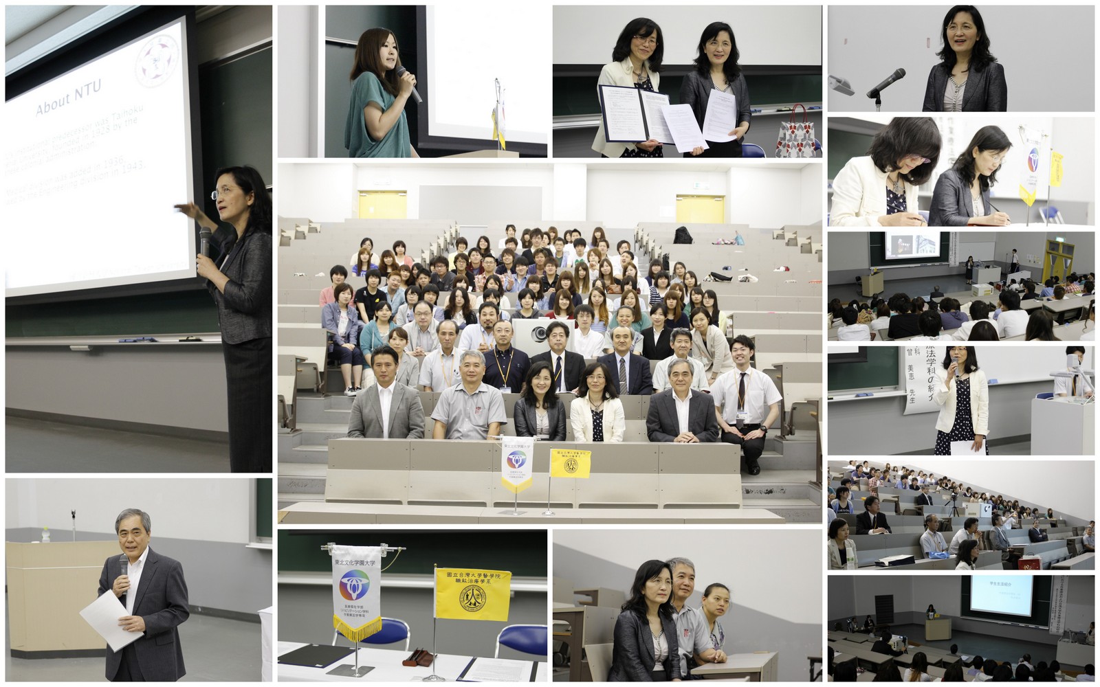 交流に向けて,2014年4月30日に本学作業療法学専攻の本多ふく代(学科長),王治文(准教授),半沢正道(助手)の3名で台湾大学に訪問してきました.そして,6月23日には台湾大学作業療法学科の曾美恵学科長が本学に訪問し,交流に向けて正式に覚書を交わしました.覚書交換後は,曾 学科長から台湾大学作業療法学科の紹介が行なわれ,教員と学生たちと意見を交換しました.本学作業療法学専攻からも,3年生の古木里沙さんから学生生活について紹介が行なわれました.