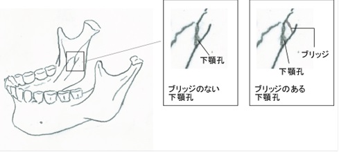 そんなある日,人類学教室の非常勤講師でいらっしゃったD先生の講義を受ける機会があった.D先生は東北大学解剖学教室の大御所だけではなく,「形態小変異」という画期的な方法を用いてヒトの系統や移動を研究されている人類学の大御所でもある.「形態小変異」による方法とは,たとえば「下顎孔」に「ブリッジ」が認められるか認められないかによってヒトの系統を探る方法である.(図1)