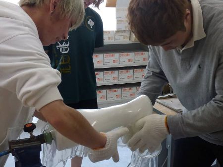 3年次前期開講科目である義肢装具学実習では、義肢装具士の先生のご指導を仰ぎながら、プラスチック製の下肢装具を作成する実習を行っています。