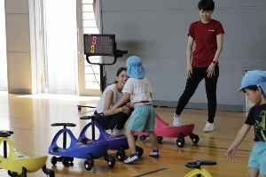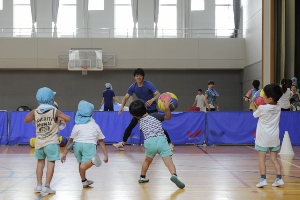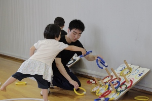 園児たちは体育館に到着すると初めはじっ~と学生や遊具の様子をうかがって緊張している様子。