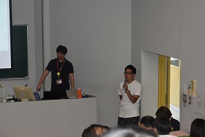 実際に学科説明の際にも前で卒業後の話等もしてもらいました。高校生とも大学時代の話や、就職後の状況等を、生の声として伝えてもらいました。高校生はもちろん、在学生も色々と質問攻めでした。