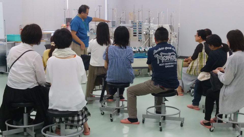 つい先日、実習室に新たに設置された「人工心肺装置」についても、皆さんに体験していただきました。