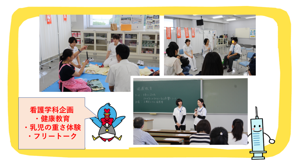 学生による健康教育、乳児の重さ体験、学生とのフリートーク、等