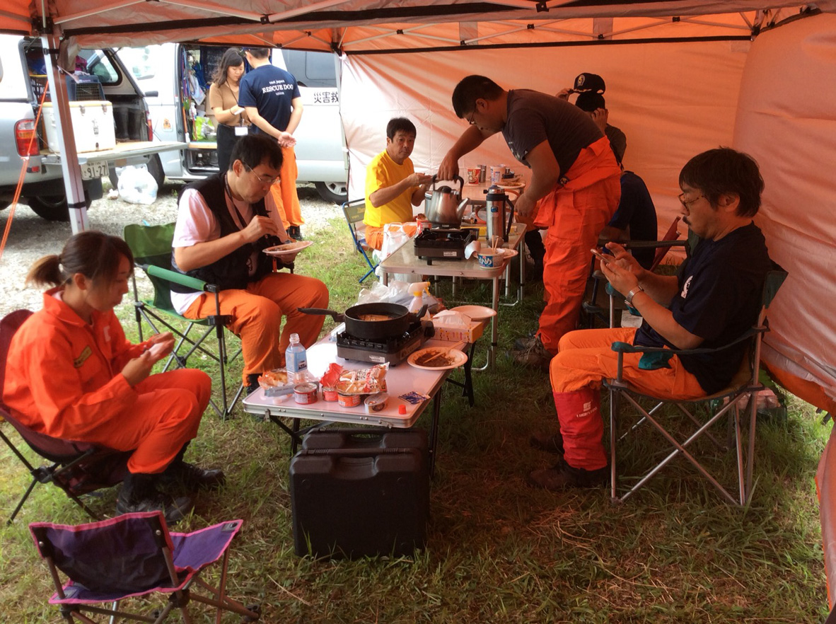 岡教授とルカは、「東日本救助犬ユニオン」のチームの一員として、6日の夜の仙台発フェリーに乗船し、翌7日11時に苫小牧港に着岸して、そこから車で1時間弱の厚真町へ向かいました。厚真町ではテント生活を送りながら、2日間にわたって、テレビでも報道された吉野地区や幌内地区で、自衛隊や消防の捜索の合間に、他の救助犬団体と連携して行方不明者の捜索活動を行いました。また、航空自衛隊や警視庁の救助犬や警備犬も捜索に来ていました。