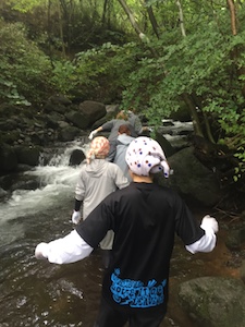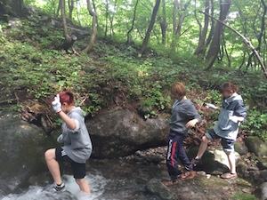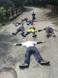 冷たい沢登りの後は、日の当たるアスファルトで温まります!