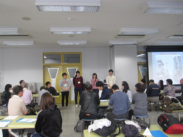 みんなで仙台市の昔の写真や今の写真を見た後に、せんだい豊齢学園の受講者の皆さんの若い頃の仙台の話や生活のことなどを聞かせていただきました。始終なごやかな雰囲気で、学生は興味深そうに話しに聞き入っていました。みんながお互いに新鮮な経験ができたようです。