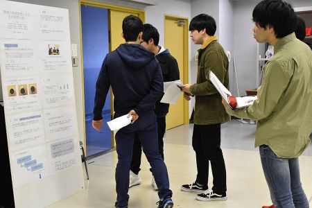 科目後半では,各グループが,実習から得た知識?技術を用いたオリジナル実験を計画?実施し,得られた結果についてポスター形式でまとめた報告会を行います.学生同士で積極的なディスカッションが行われ,教員からの質問に対しても的確に回答していました.報告会の最後に,学生?教員の投票によりグッドポスター賞の表彰が行われました.