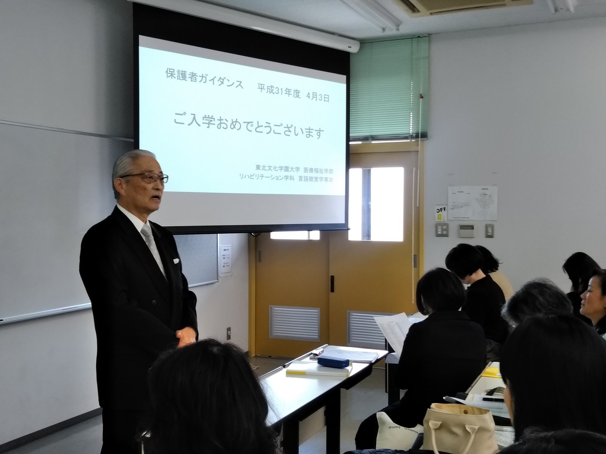 入学式の後は、ガイダンスでした。新入生と保護者の皆様とに、大学生活、大学での勉強、臨床実習、国家試験などについて情報提供をさせていただきました。本学のSA制度など、特色ある教育システムについてもお話いたしました。下の写真は、保護者ガイダンスの様子です。学科長の説明にも熱がこもりました。