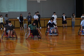 また、模擬授業は「パラリンピックから学ぶ」と題して、体育館で車いすバスケットの実技を交えた授業です。