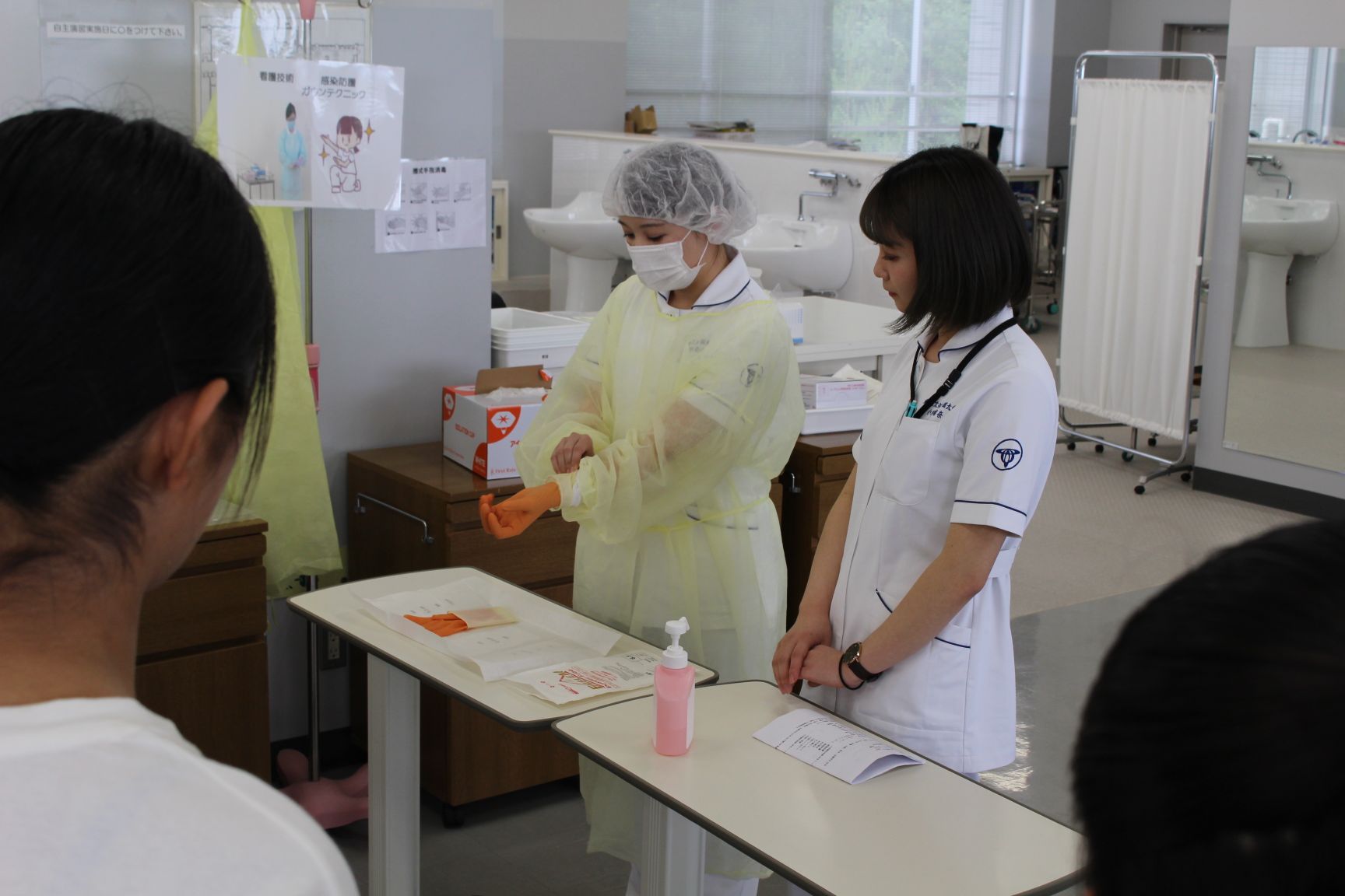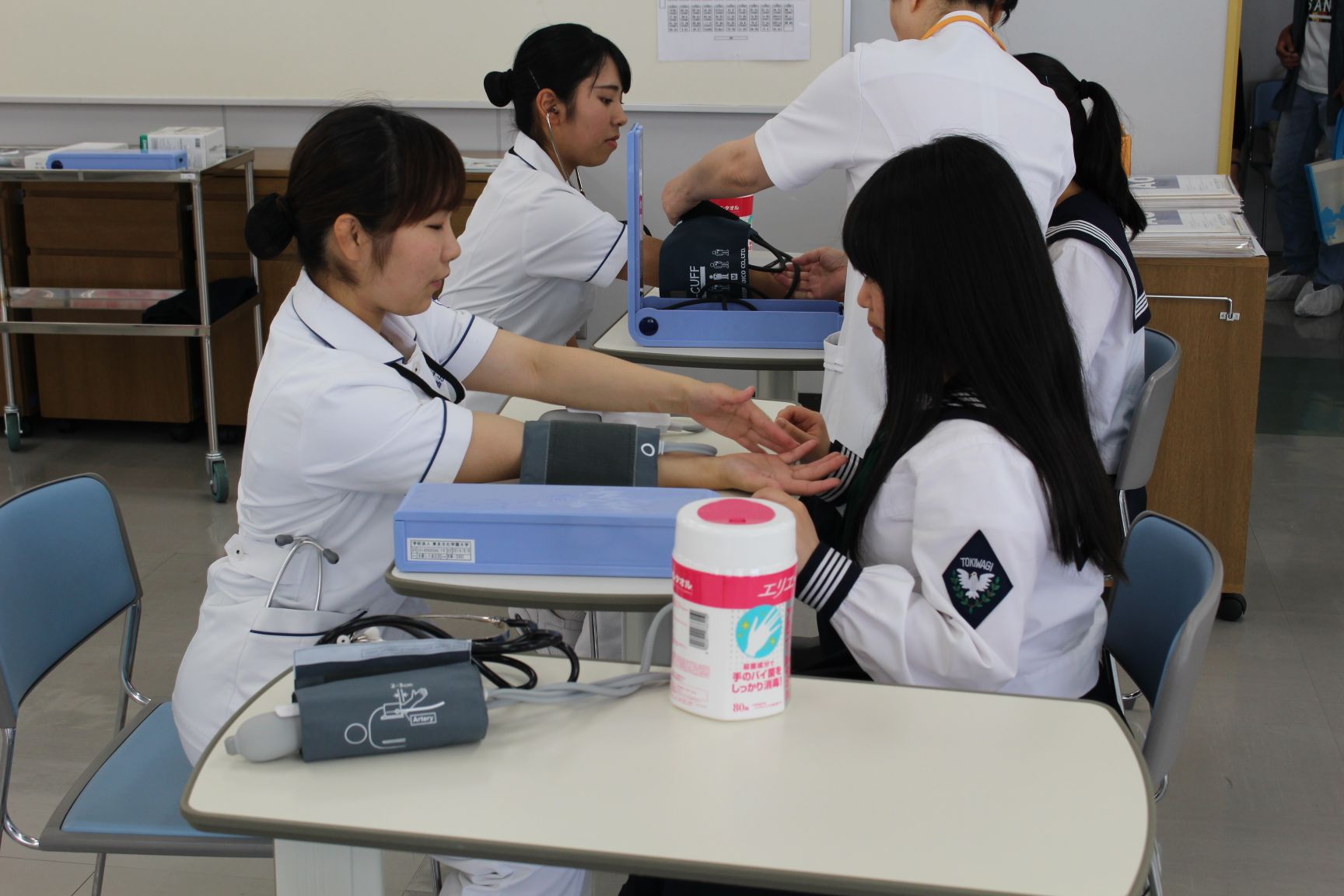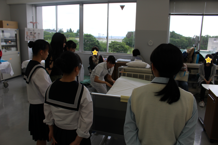 看護学科では主に基礎看護学の講義で学ぶ内容を体験して頂きました。