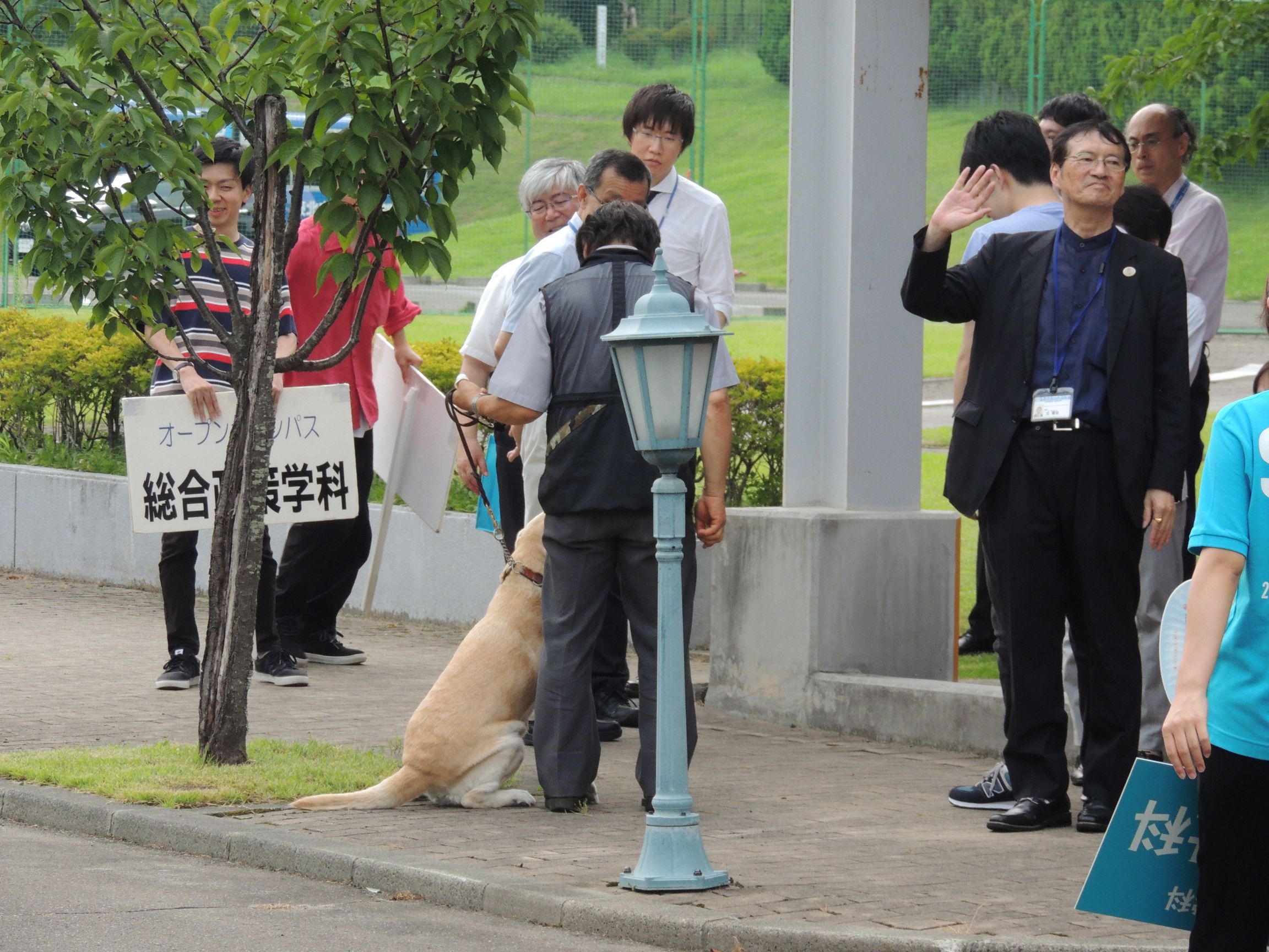 バス見送り。岡学部長の愛犬(災害救助犬)もカメオ出演!