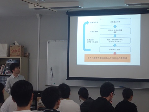 大学教員と卒業生から、それぞれ話題提供をして頂きました。卒業生からの話題提供では、生活を支援する具体例や、“どうして動作ができないのか” を環境や人の側面から説明していただきました。