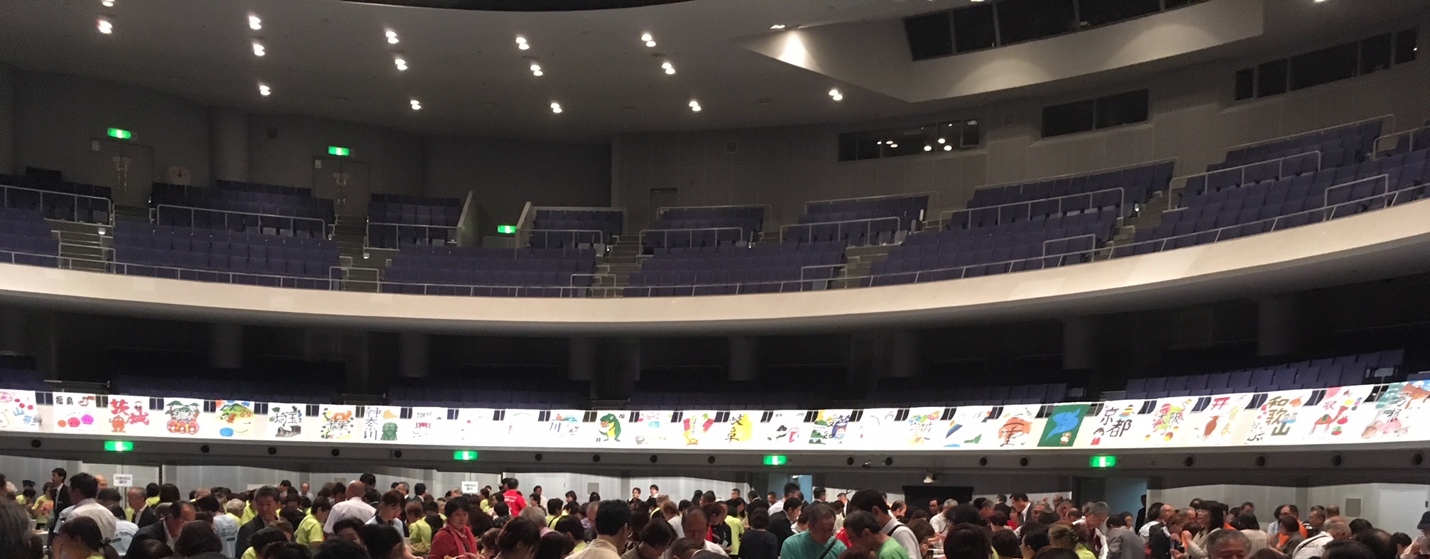 仙台サンプラザの大ホールにレクリエーションを学ぶ学生の47都道府県の旗が一斉に並び一つになって歓迎ができました。