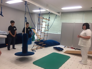 OT専攻の授業の際に使う実習室や発達支援教室などを高校生、その保護者の方々に在学生が、説明しながら案内しました。