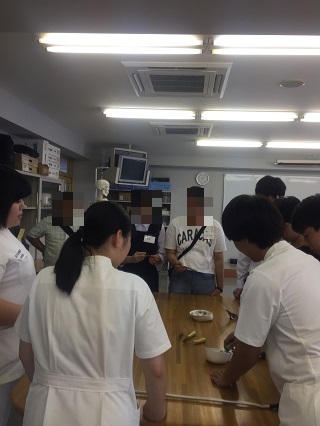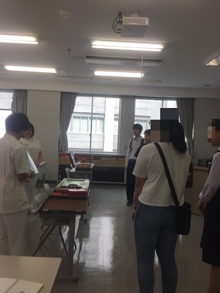 評価学実習室では臨床実習でも実際に使った検査器具の説明をしています。実習でも行った検査法だったので、実体験も含めて説明していました。