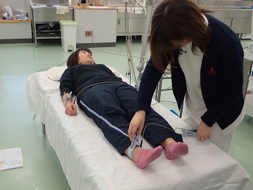今回は、心電図測定の授業(実習)の様子です。心電図測定では、本学の科学技術学部臨床工学科の協力を得て実施しました。
