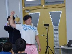 今回は腰椎分離症、膝靭帯損傷、投球障害肩といったスポーツ障害についての講義と、実際の理学療法評価や介入についての実習を実施しました。実例を挙げ、身振り手振りを交え非常に分かりやすく指導して下さっています。