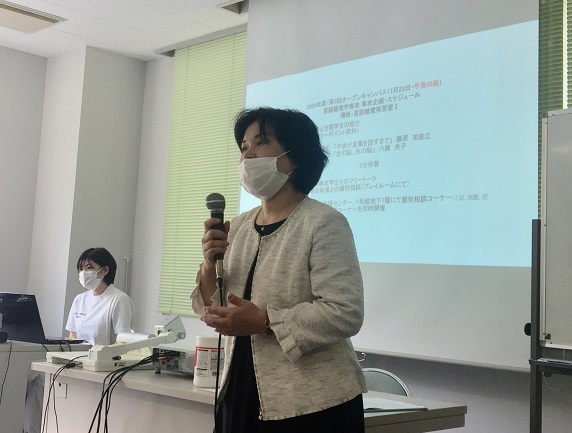 今年の第3回オープンキャンパスが、7月23日に行われました。連休初日にもかかわらず、熱心な高校生の皆さんをたくさんキャンパスにお迎えすることができました。教員一同心から感謝申し上げます。司会者も熱が入りました。もちろん、マスク着用です。