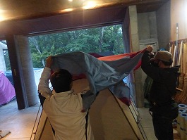 最後にソーシャルディスタンスを保ってのミーティング。初日の夜は雨がひどかったため、男子は屋根のあるところで1名ずつテント内に、女子は常設テントで就寝です。