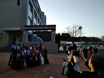 学位記授与のあとは、記念撮影をしました。シャッターを切る時だけマスクを外して、終わるとまたマスク。ですが名残は尽きず、いつの間にか快晴も夕闇に???