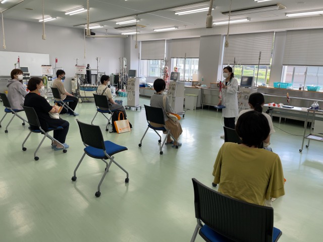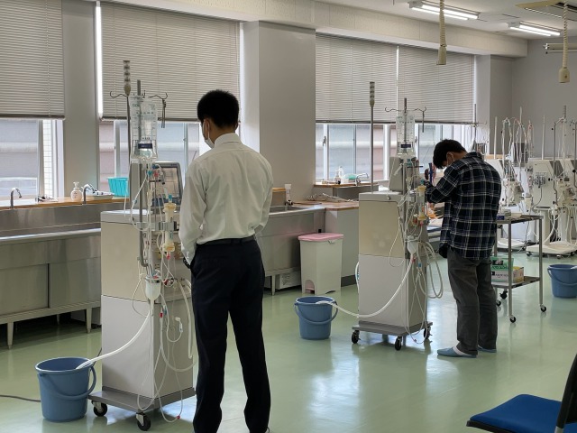 模擬授業では、「透析装置」の回路充填(プライミング)を実施しました。