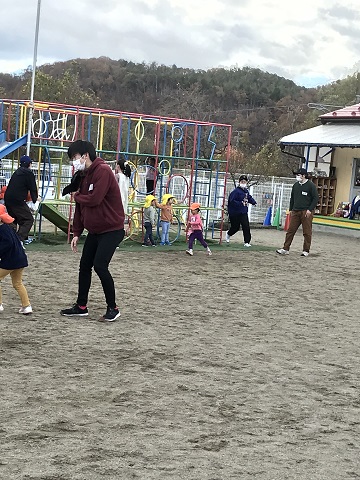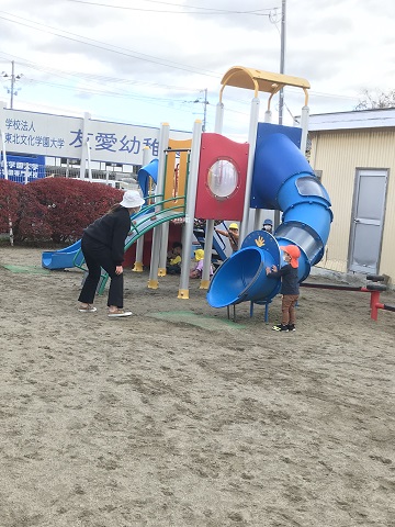 それを受けて、本科目では、附属幼稚園「友愛幼稚園」に協力いただき、幼児期の子どもたちと触れ合う機会を設けています。年少さん、年中さん、年長さん、それぞれの学年の子どもたちの様子を一緒に遊んだり、取り組みの場面を見学したりしながら、楽しく学ぶ時間を作っています。表情も生き生きと童心に帰って楽しんでいます。