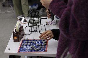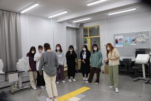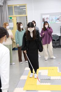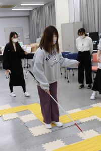 目隠しをして白杖を使って点字ブロックを歩く、対戦ゲームが行われました。