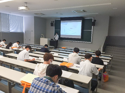 最初に学科長の挨拶及び入試説明が行われ、その後、3年生の在学生からゼミやサークル活動、大学の生活について実体験を踏まえた話がされました。続いて、副学科長による学科特色説明が行われ、休憩を挟んで、久保田茂裕准教授によって、「経済学の視点で社会を捉える-需要?供給分析-」と題して模擬授業が行われました。模擬授業では、参加した高校生に、経済学の需要?供給分析のフレームを使って、ある財やサービスの均衡価格の変化について分析して頂きました。