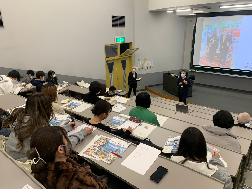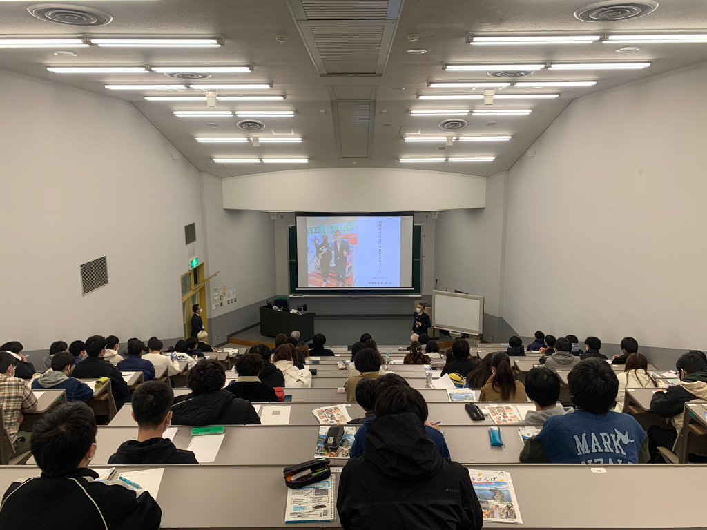 本学部2年次後期の「キャリア形成Ⅳ」では、社会人として活躍している方をお招きして働くことの意味や、これから社会に出ていく学生の皆さんへのアドバイス等を講演していただく時間を設けています。