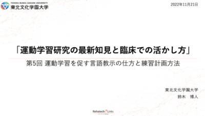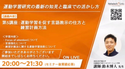 リハテックリンクス株式会社が開催するwebセミナーにて、本専攻の鈴木博人 講師がセミナー講師を担当しました。主に理学療法士?作業療法士?言語聴覚士を対象とした研修会であり、運動学習理論の観点から声がけの仕方や練習プログラムを組み立てる上での注意点を解説しました。
