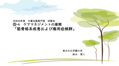 当日は、筋骨格系疾患および廃用症候群におけるケアマネジメントの展開の研修日であったため、骨折、変形性関節症、脊髄損傷、関節リウマチ等の疾患特性と、そのような疾患から想定できる日常生活上の留意点について説明させていただきました。