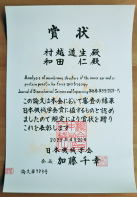 本学科の和田仁名誉教授が村越道生准教授(金沢大学理工研究域フロンティア工学系)との下記の共著論文で日本機械学会賞を受賞しました。