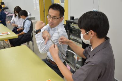 関節角度を高校生同士で測定しあったり、”動かない関節”について体験をしていただきました。