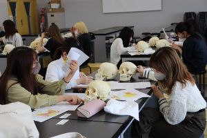 下の写真は、骨学実習(頭蓋骨や眼窩の観察とスケッチ)と豚眼解剖実習の風景です。