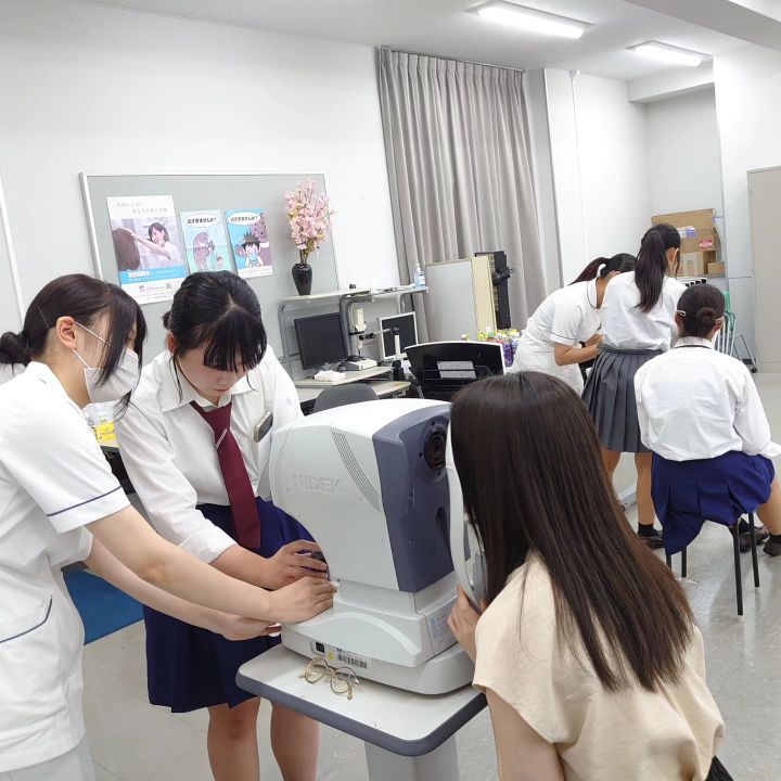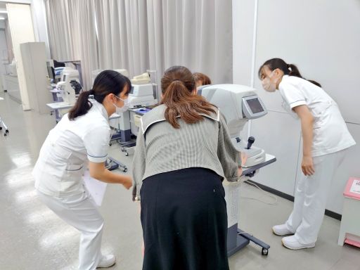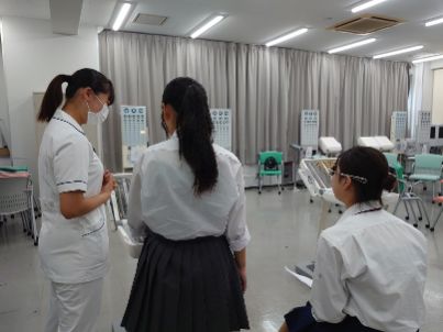 ?高校生同士で検査体験(視力検査、ゴールドマン視野検査、眼底検査を行ないました。参加者の高校生は、3年生に検査を教えてもらいながら、上手に測定していました。初めて検査体験を行なった男子高校生は、「今まで使ったことがない筋肉を使った」と感想を教えてくれました。)