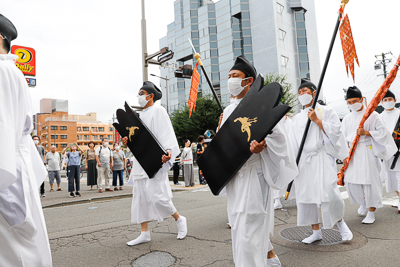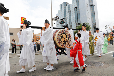 去る9月17日(日)に国宝大崎八幡宮例大祭の神幸祭行列が行われ、大神輿渡御に本学から渡邊洋一特任教授?淡路智典准教授以下経営法学部の4年生3人?2年生1人が参加、同社大神輿の担ぎ手となって八幡町界隈を練り歩きました。
