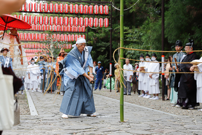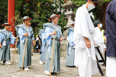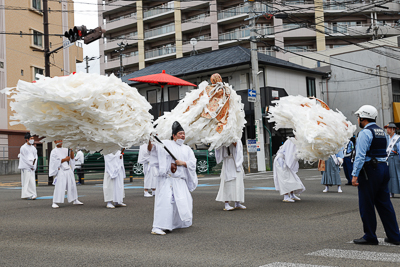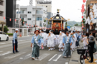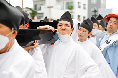 当日は曇天でそれまでの暑さはなく、神幸祭の御練は恙無く行われました。参加した本学の学生達は初参加ではありました。30貫余(約1トン)の大神輿を担ぎ手60余人が3交代で担ぐことになりましたが、御練(おねり)の最中に沿道の観覧者からエールを送られ、八幡小学校校庭他で行われた御旅所祭(小休止)のお振舞を受けるなどして、大変感激していました。