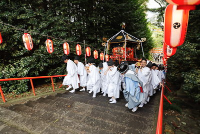 御練の最後は八幡宮参道の大鳥居前から約百段の石段を担ぎ手全員で担ぎ上げることになりましたが、八幡様の御加護あって何のトラブルもなく全員社殿での還御祭に臨むことが出来ました。
