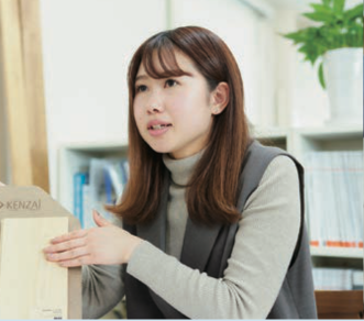 インテリアコーディネーターは、お客様のご 要望を伺いながら、専門的な視点からアドバ イスや提案を行い、空間をコーディネートする仕事です。家づくりは大きなライフイベントな ので、お客様にとって後悔が残らないよう常に気をつけています。例えば図面や素材サンプルだけでなく、施工事例や参考画像などをできるだけ用意してコミュニケーションを重ね、イメージを共有できるようにしています。 お客様ごとにライフスタイルやお好みのテイストは様々で、一棟として同じ仕上がりにはなりません。その点がたいへんであり、同時に楽しさややりがいを感じる点でもあります。お引き渡しの時 、 お客様に「これにして良かった」と言ってもらえたり、喜んでいるお顔を見 ると、すごく嬉しいですね。今後はさらに経験 を積みながら専門性を磨き、多様なご提案が できるよう、プロとして力をつけたいです。