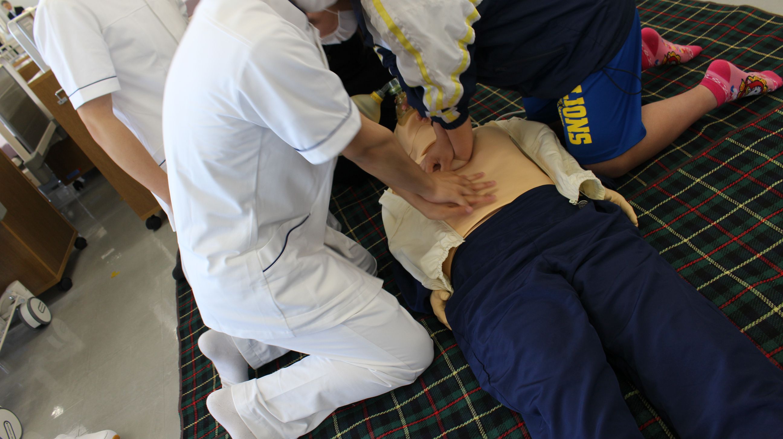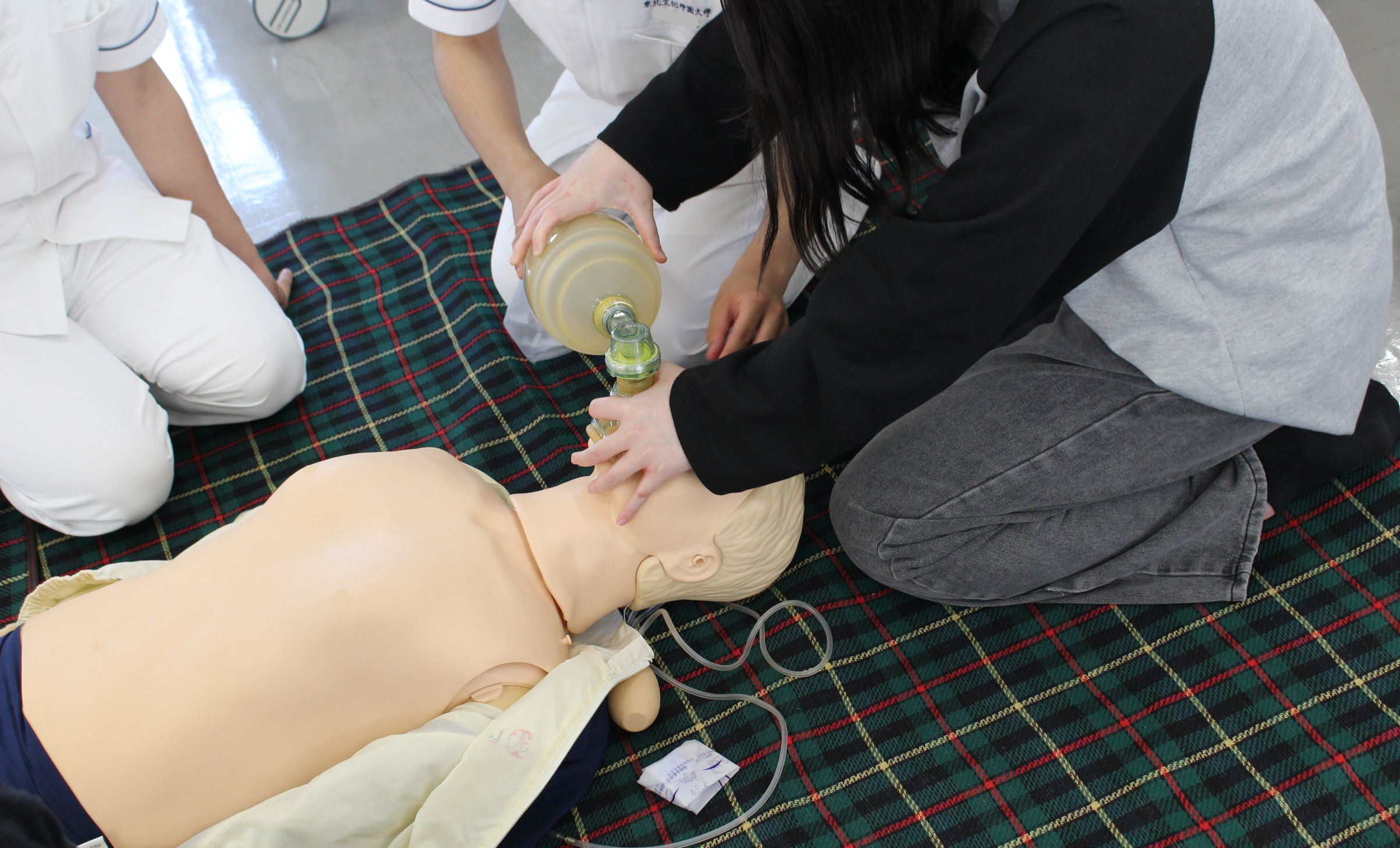 一時救命処置では、呼吸法や心臓マッサージの体験を