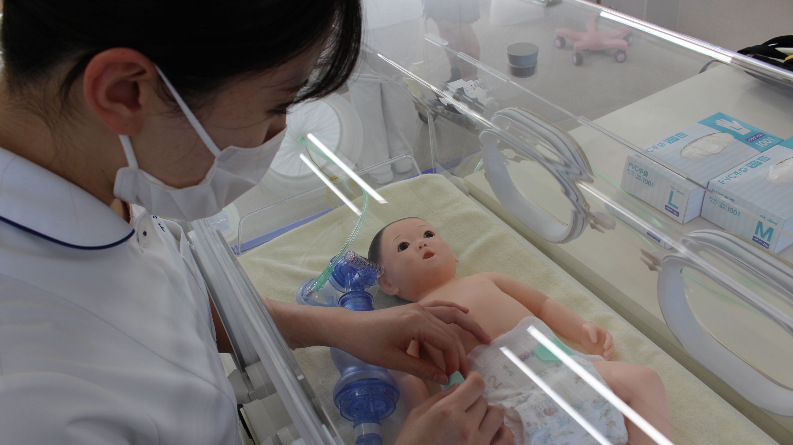 シミュレーター人形では呼吸や心臓の動きなどを、