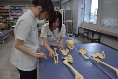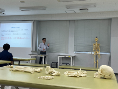 鈴木副専攻長からの専攻説明に続き、「解剖学から紐解く人体の不思議」と題したミニレクチャーと解剖学実習で使用する骨模型を用いたグループワークを行いました。また、その後参加いただいた方々からの質問に学生がリアルな声として回答するフリートークを実施しました。