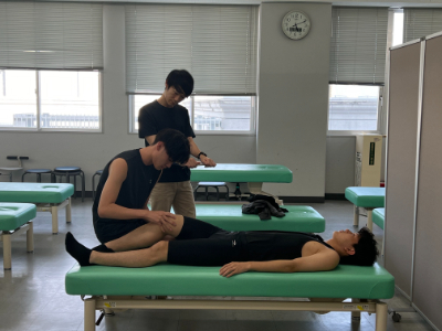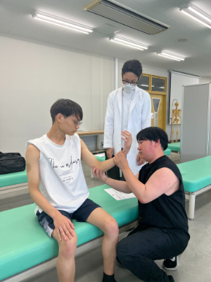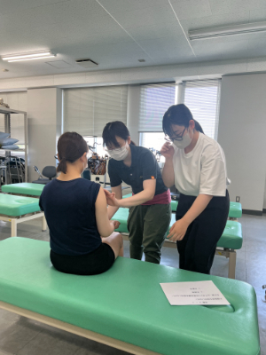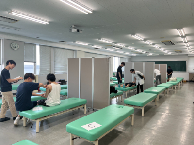写真は先日行われた体表解剖学(触診)の実技試験の様子です。同じく1年次前期に学んだ解剖学?解剖学実習の知識を基に、皮膚の上から骨や動脈を探します。